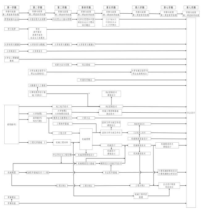 大学英语、大学物理、物理实验、高等数学、机械制图、 工程力学、机械工程材料、 机械原理、机械设计、电工电子技术、 机械精度设计基础、流体力学与液压传动、机械制造技术基础、 机床数控技术、 PLC控制技术、工业机器人技术等理论课程