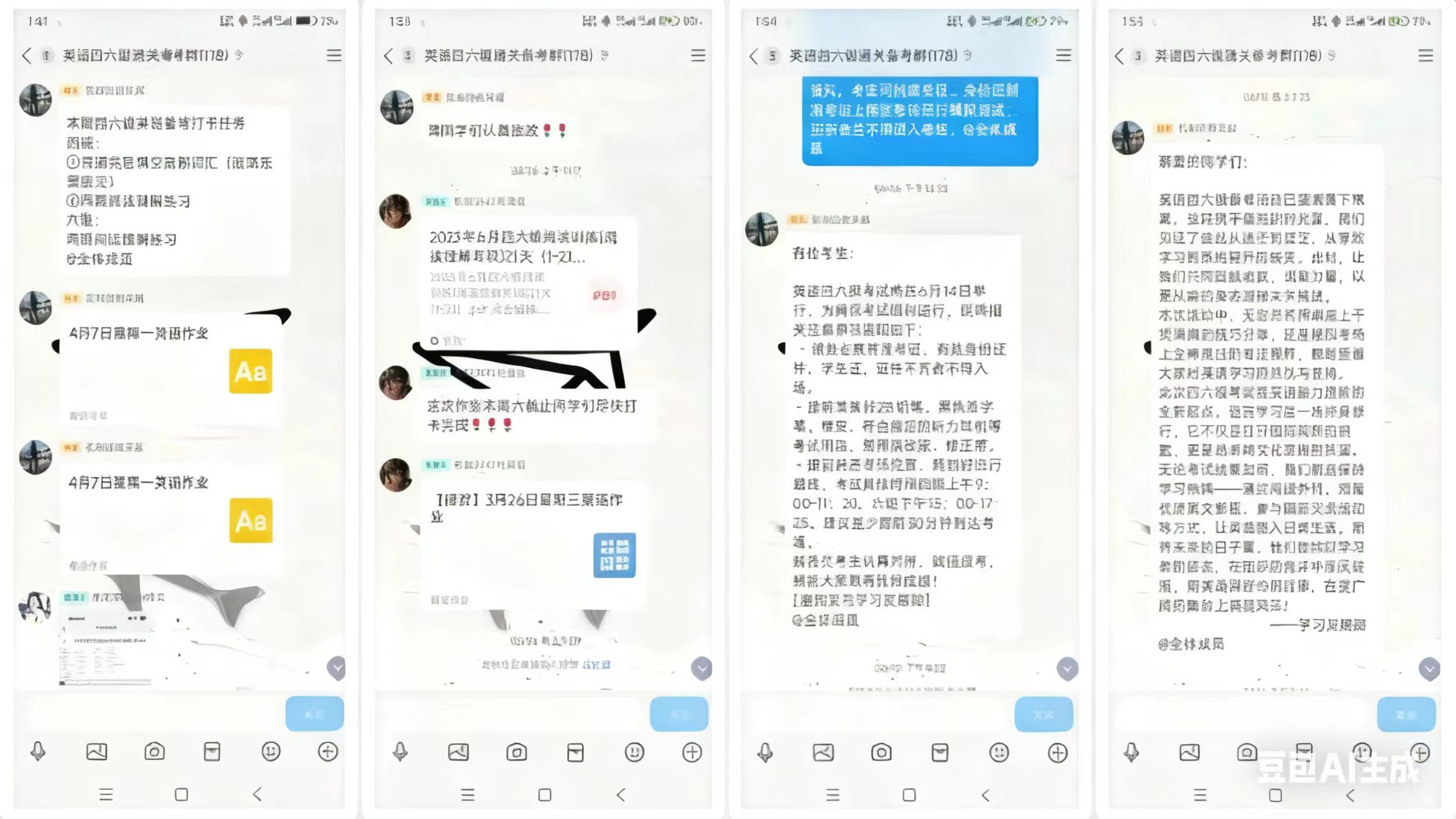 除了专题讲座,学院还建立了四六级学习QQ群,以班级为单位成立学习小组,由组长督促同学们日常打卡学习。从3月12日至四六级考试前,同学们在群内完成词汇背诵、翻译练习、语法梳理等基础打卡任务,互相监督、彼此激励,形成了“比学赶超”的良好学习氛围。同时,学院学习发展部还整理了四六级真题、模拟题、词汇手册、听力音频、写作模板等优质学习资料,供群内同学免费下载使用,为大家的备考提供了充足的资源支持。