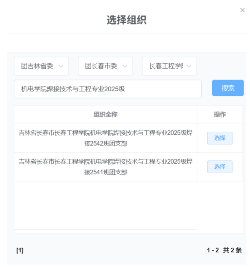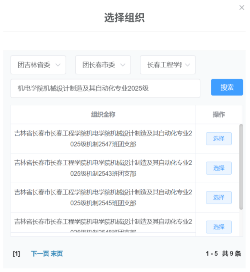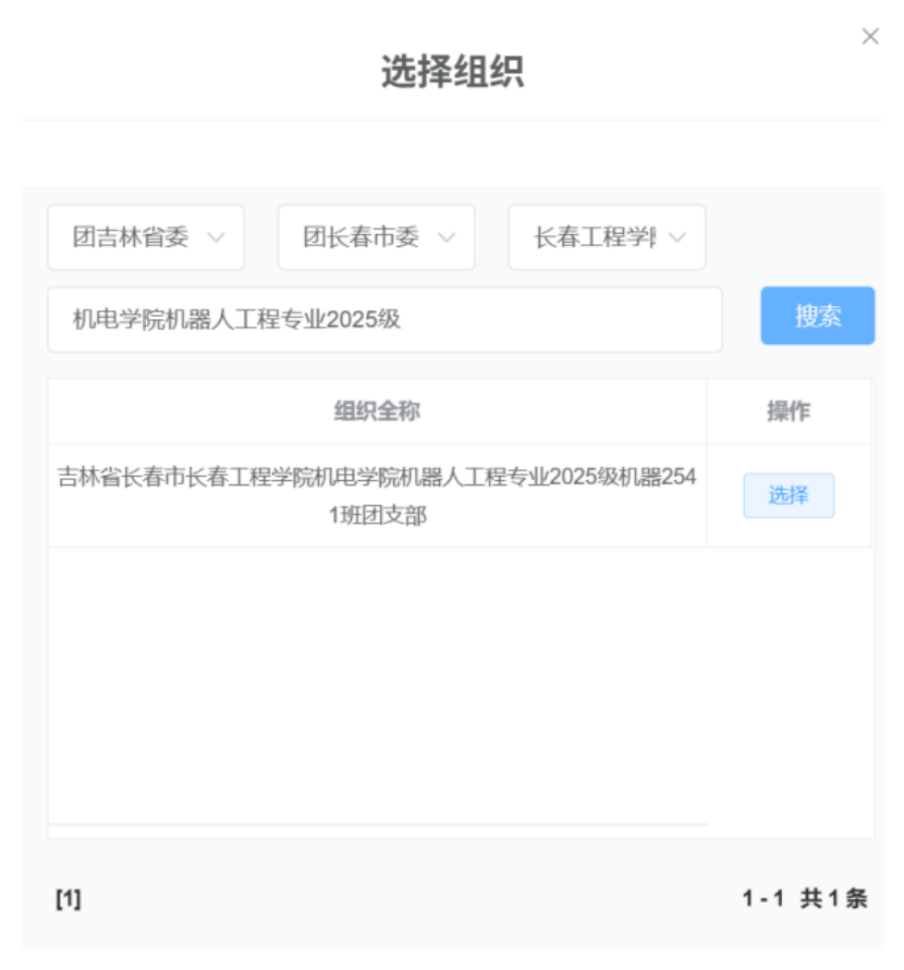 申请转入组织按步骤搜索:团吉林省委-团长春市委-长春工程学院团委-机电学院XX专业2025级XX班团支部,即可找到自己班级团支部(如下所示)