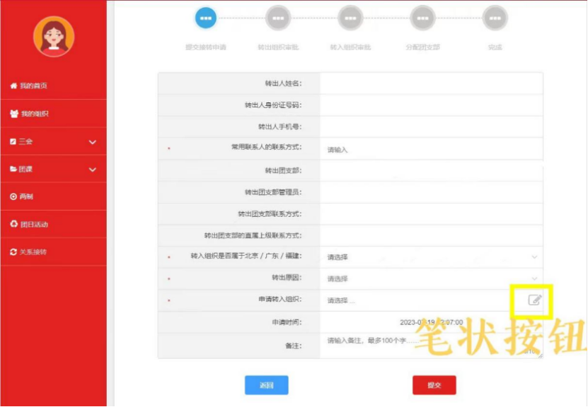申请转入组织:点击右侧笔状按钮,跳转页面。