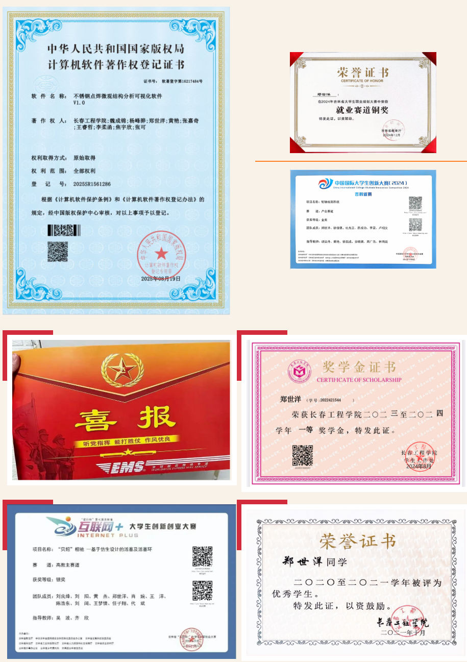 科研上,发表《碳纤维复合材料与钛合金激光焊工艺研究》《线能量对超细晶粒钢激光焊接头组织与性能影响》等论文,拥有一种基于微结构增强铝合金/碳纤维复合材料激光焊电池壳体、一种全方位探头姿态调节结构等多项专利,著有不锈钢点焊微观结构分析可视化软件v1.0等多款软著,还参与《微织构设计对碳纤维和轻质合金连接影响及仿真优化研究》《不锈钢点焊接头在线超声波检测与工程化应用技术研究》等多项国家级、省级科研项目,在学术与实践创新中展现突出实力。