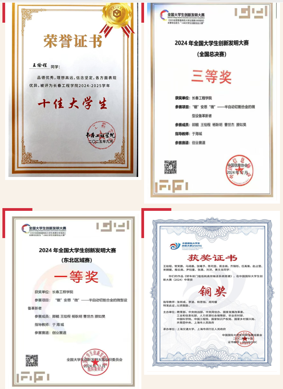 王绘程同学学分绩点4.12,专业排名第一,曾获国家级奖项,如:中国国际大学生创新大赛(2024)产业赛道 国赛铜奖、“高教杯”全国大学生先进成图技术与产品信息建模创新大赛数字化设计赛道 国赛一等奖、“高教杯”全国大学生先进成图技术与产品信息建模创新大赛 国赛团体二等奖、全国大学生创新发明大赛 国赛三等奖、“高教杯”全国大学生先进成图技术与产品信息建模创新大赛主赛道 国赛三等奖等。