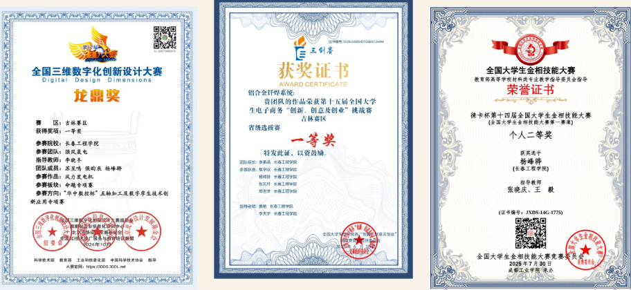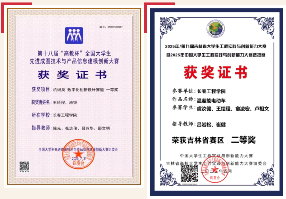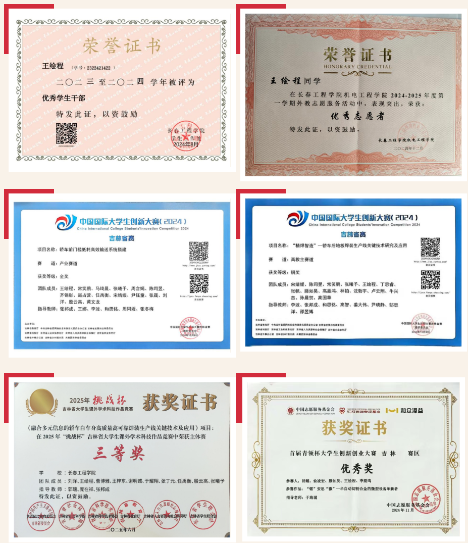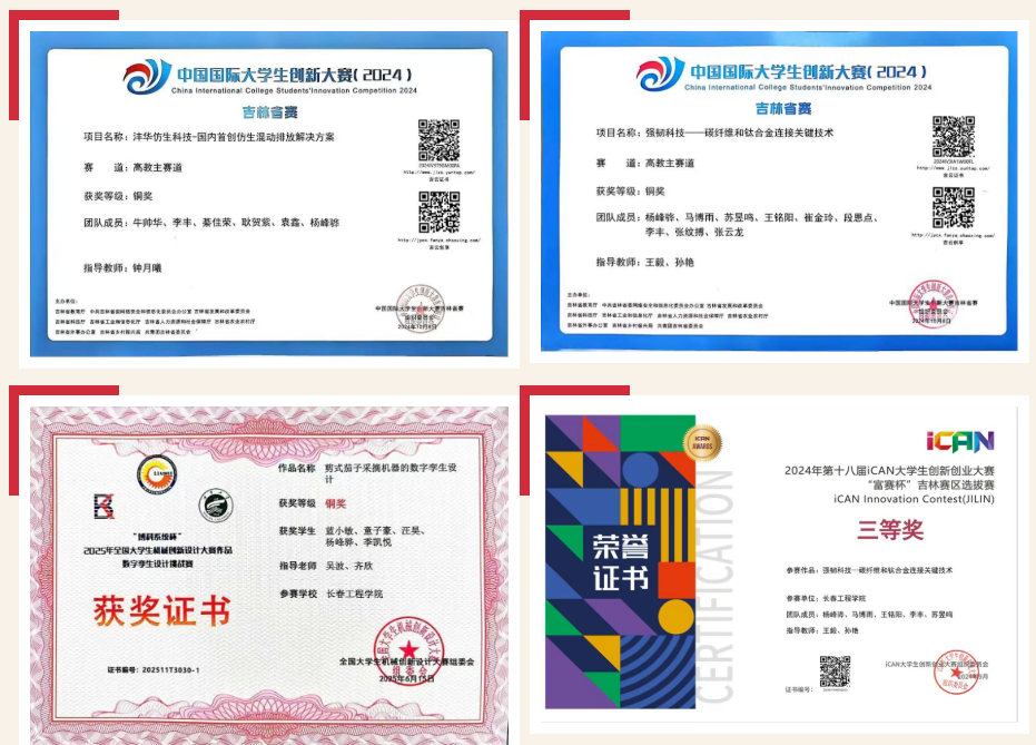 省级奖项,如:“高教杯”全国大学生先进成图技术与产品信息建模创新大赛主赛道 省赛三等奖、中国国际大学生创新大赛(2024)产业赛道 省赛金奖、中国国际大学生创新大赛(2024)高教主赛道 省赛铜奖、“青领杯”大学生创新创业大赛 省赛优秀奖、全国大学生创新发明大赛 省赛一等奖、中国大学生工程实践与创新能力大赛 省赛二等奖、“高教杯”全国大学生先进成图技术与产品信息建模创新大赛数字化设计赛道 省赛一等奖、“高教杯”全国大学生先进成图技术与产品信息建模创新大赛主赛道 省赛三等奖、“挑战杯”全国大学生课外学术科技作品竞赛 省赛三等奖、中国国际大学生创新大赛(2025)产业赛道 省赛金奖。