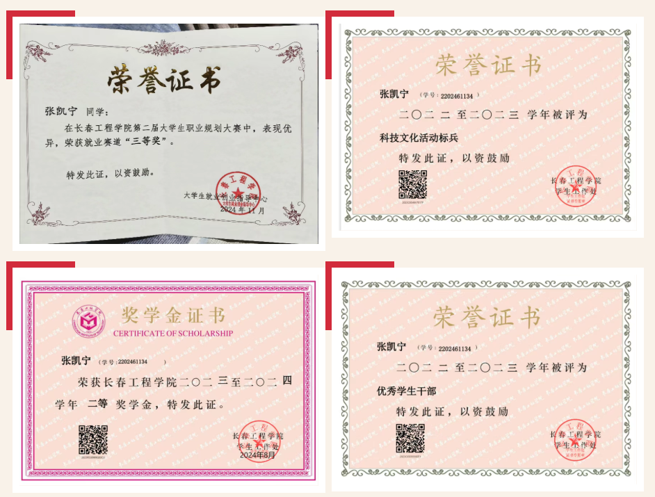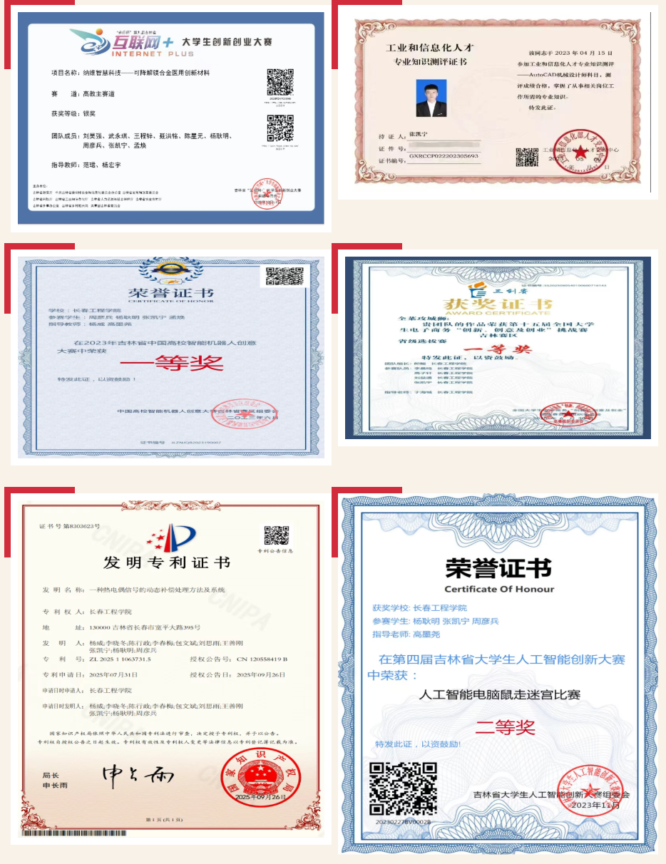 张凯宁同学入学以来表现卓越,在学业与竞赛领域均斩获佳绩。两次二等奖学金 两次国家励志奖学金;在竞赛方面,获机器人大赛国赛三等奖、省赛一等奖,第四届大学生人工智能创新大赛二等奖,互联网+大学生创新创业大赛“银奖”,吉林省中国高校智能机器人创意大赛一等奖,第十五届全国大学生电子商务三创挑战赛一等奖,第二届大学生职业规划大赛就业赛道三等奖等;同时荣获长春工程学院优秀学生干部、科技文化活动标兵、学习标兵、优秀团员、优秀学生、优秀志愿者,吉林省大学生就业能力拓展训练“优秀学员”等荣誉称号,所在团支部获长春工程学院红旗团支部。此外,还取得工业和信息化人才专业知识测评证书、发明专利证书,在专业能力与创新实践上尽显风采。