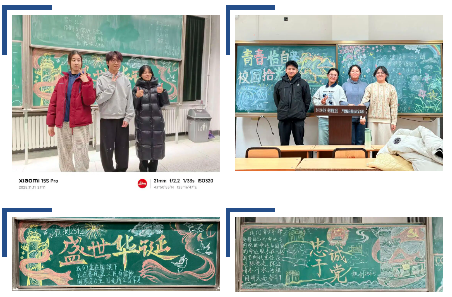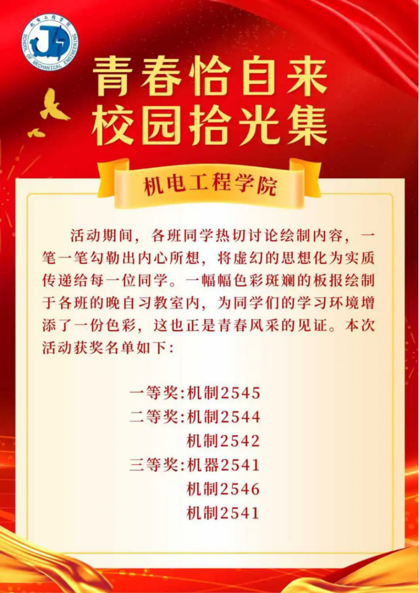 为了营造积极向上,富有内涵的校园氛围,建设和谐美好的校园环境,深化学生对学风建设和党政活动的清晰深刻理解。机电工程学院于2025年11月10日至12日在各班晚自习室举办了“青春恰自来,校园拾光集”板报征集活动。参与本次活动的有2025级全体新生。本次活动由宣传调研部负责。